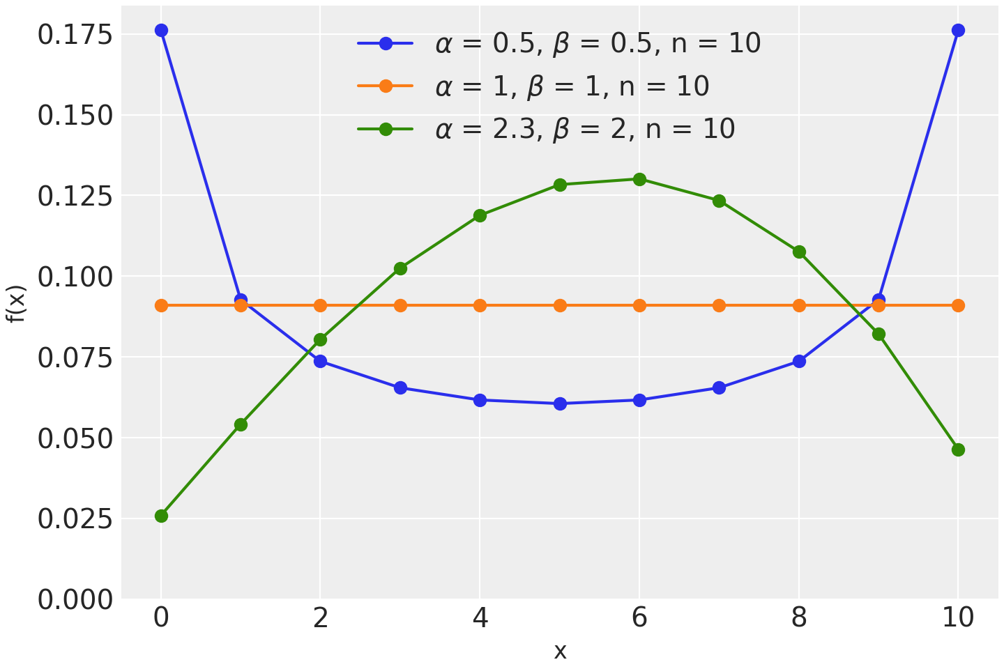 \[f(x \mid \alpha, \beta, n) = \binom{n}{x} \frac{B(x + \alpha, n - x + \beta)}{B(\alpha, \beta)}\](