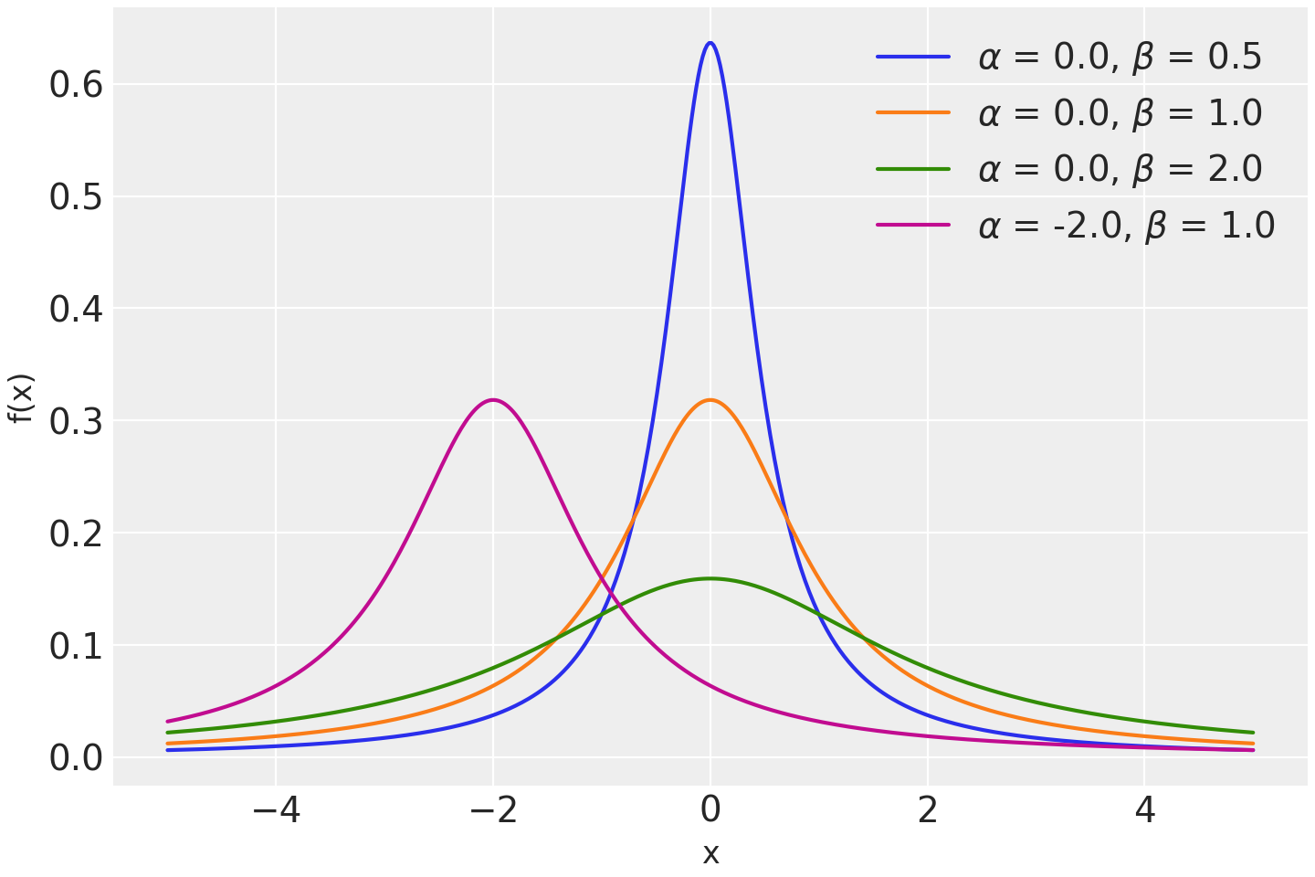 \[f(x \mid \alpha, \beta) = \frac{1}{\pi \beta [1 + (\frac{x-\alpha}{\beta})^2]}\](