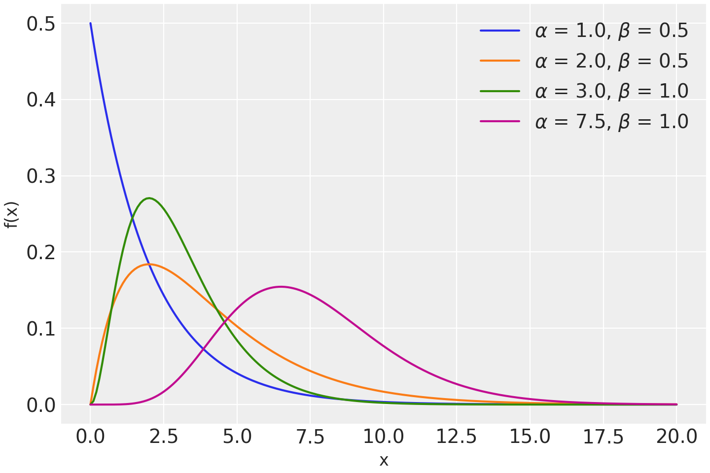 \[f(x \mid \alpha, \beta) = \frac{\beta^{\alpha}x^{\alpha-1}e^{-\beta x}}{\Gamma(\alpha)}\](