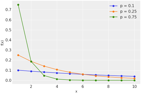 \[f(x \mid p) = p(1-p)^{x-1}\](