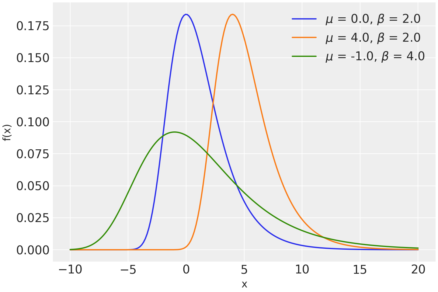 \[f(x \mid \mu, \beta) = \frac{1}{\beta}e^{-(z + e^{-z})}\]where